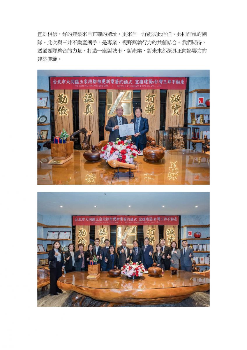 宜雄相信,好的建築來自正確的選址,更來自一群能彼此信任、共同前進的團隊。本案與台灣三井不動產攜手合作,是專業、視野與執行力的共創結合。我們期待,透過團隊整合的力量,打造一座對城市、對產業、對未來都深具正向影響力的建築典範。